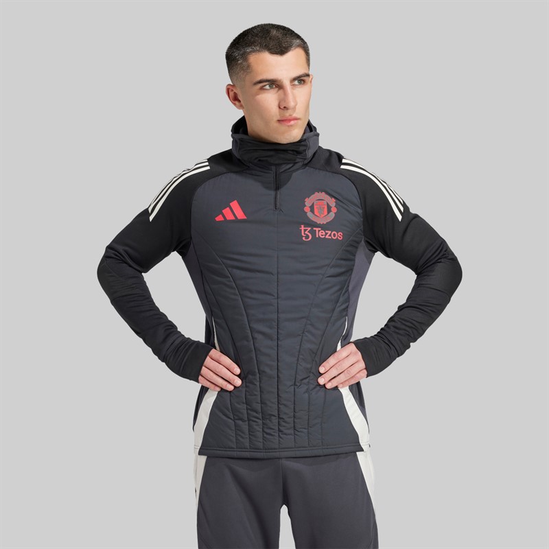 - adidas MUFC Manchester United long sleeve hooded top. Keep warm on the training pitch without missing a beat. Manchester United players wear adidas tops like this one when they're preparing for their biggest matches. Whether you're warming up or pushing the pace, it keeps the chill at bay thanks to its fleece build, targeted padding and adjustable balaclava. All the while, AEROREADY controls moisture to keep you dry and focused on your football.This product is made with at least 70% recycled materials. By reusing materials that have already been created, we help to reduce waste and our reliance on finite resources and reduce the footprint of the products we make. IS8090