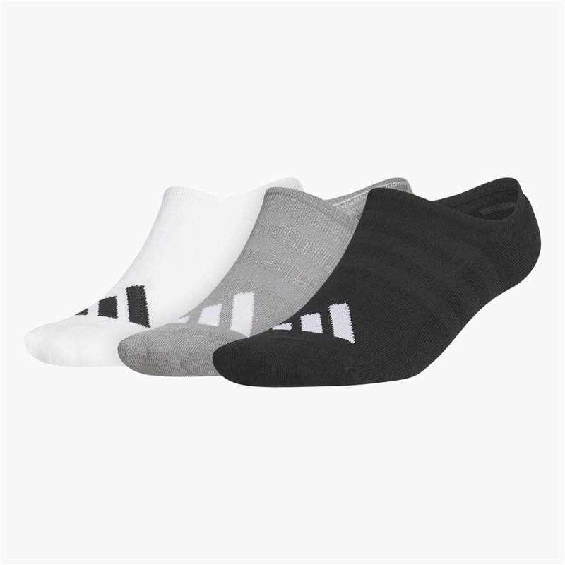 - adidas three pack no show socks. These adidas golf socks complete your warm-weather outfit. The no-show length pairs well with shorts and tapered pants. Mesh ventilation on the top keeps feet cool though long afternoon rounds, and the compression instep adds support. A minimum of 50% of this product is a blend of recycled and renewable materials. JI9115