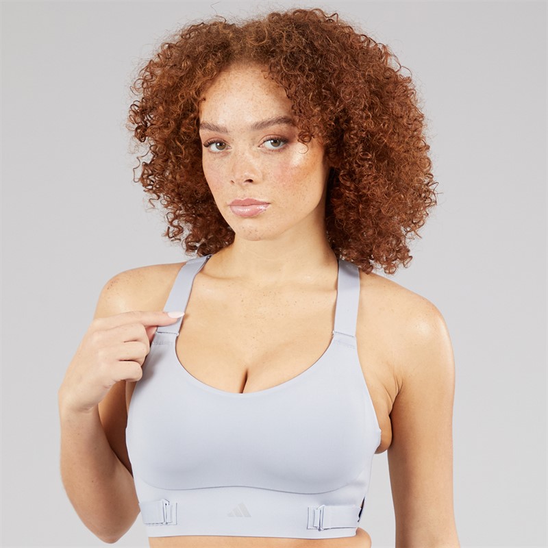 - adidas running sports bra. Push yourself to go farther and faster in this adidas running bra. The wrapped design distributes weight evenly for a secure, comfortable feel. Customise the fit to your exact needs with the adjustable straps and chest band. Stay focused mile after mile thanks to moisture-absorbing AEROREADY. Experience bounce-free, chafe-free support and run free. This product is made with at least 70% recycled materials. By reusing materials that have already been created, we help to reduce waste and our reliance on finite resources and reduce the footprint of the products we make. JV9772