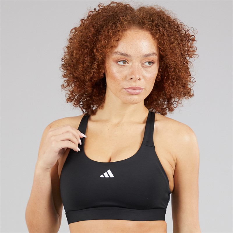 - adidas high support sports bra. Push through your sweatiest workouts with confidence in this high-support workout bra from adidas. Moisture-absorbing AEROREADY fabric keeps you dry and focused, while built-in pads provide coverage and a natural shape. Wear the adjustable straps straight or criss cross them for a fit that moves with you during boxing, basketball or soccer. This product is made with at least 70% recycled materials. By reusing materials that have already been created, we help to reduce waste and our reliance on finite resources and reduce the footprint of the products we make. IQ3382