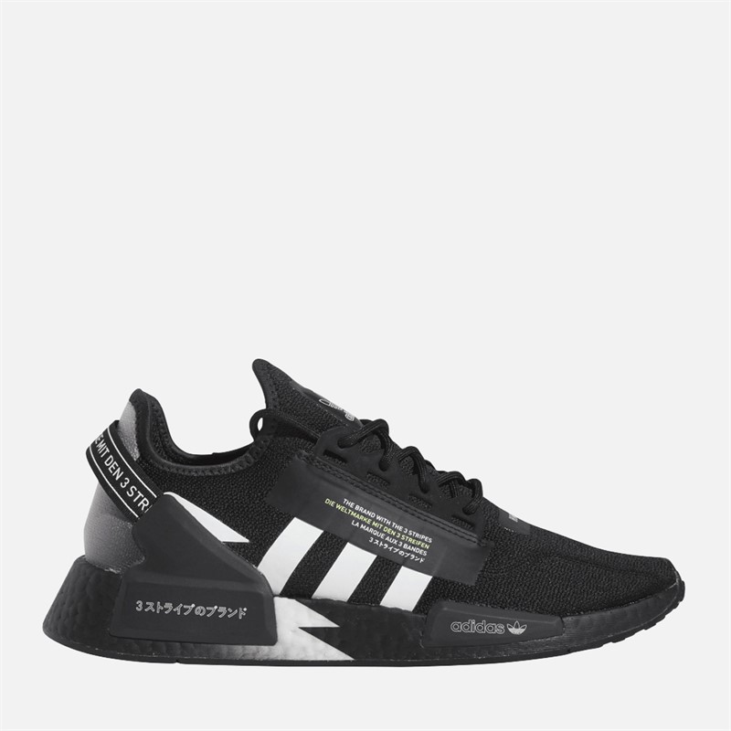 - adidas Originals low profile lace up trainers. Meet your new favourite go-tos. These adidas NMD_R1 V2 Shoes are effortlessly cool and super versatile. The breathable fabric upper features the iconic 3-Stripes with text overlays for a cyberpunk look. Style them with some joggers for an easy outfit you can wear anywhere. Know that each step will be comfortable thanks to the BOOST midsole. Made with a series of recycled materials, this upper features at least 50% recycled content. This product represents just one of our solutions to help end plastic waste. IE2245