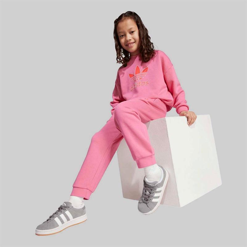 - adidas Originals Kids sweatshirt and joggers two piece tracksuit. This crew set from adidas lets kids express their creative flair. Inspired by '90s street style, the loose shape and bold Trefoil logos give any outfit an instant edge. Soft French terry fabric keeps them comfortable, whether they're adventuring in the great outdoors or getting lost in their favourite book. Whether worn as a set or mixed and matched with other pieces, this is how kids do casual. JY1152