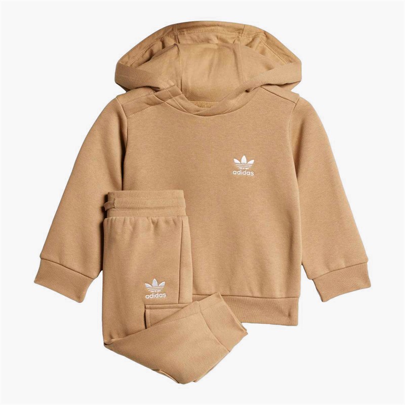 - adidas Originals Kids brushback fleece overhead hoodie and joggers two piece tracksuit. This infants' hoodie set bundles your little one in soft comfort from head to toe. Ribbed cuffs seal in warmth while recycled fleece wraps them in cloud-like softness. Contrast-colour Trefoil logos on the hoodie and cargo pants nod to adidas heritage, connecting a new generation to a legacy of sport and style. JY4868
