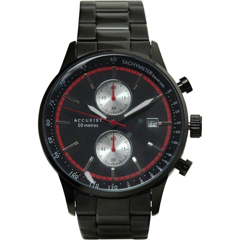 - Accurist round face chronograph watch with water resistance up to 50 meters.