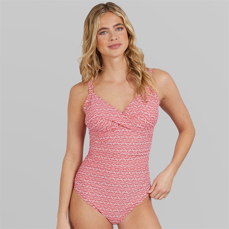 Board Angels Womens Wrap Tummy Shaping Swimsuit Red Spiral Print