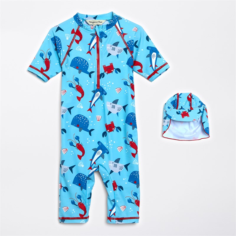 - Kangaroo Poo Kids short sleeve sunsuit and hat two piece set.