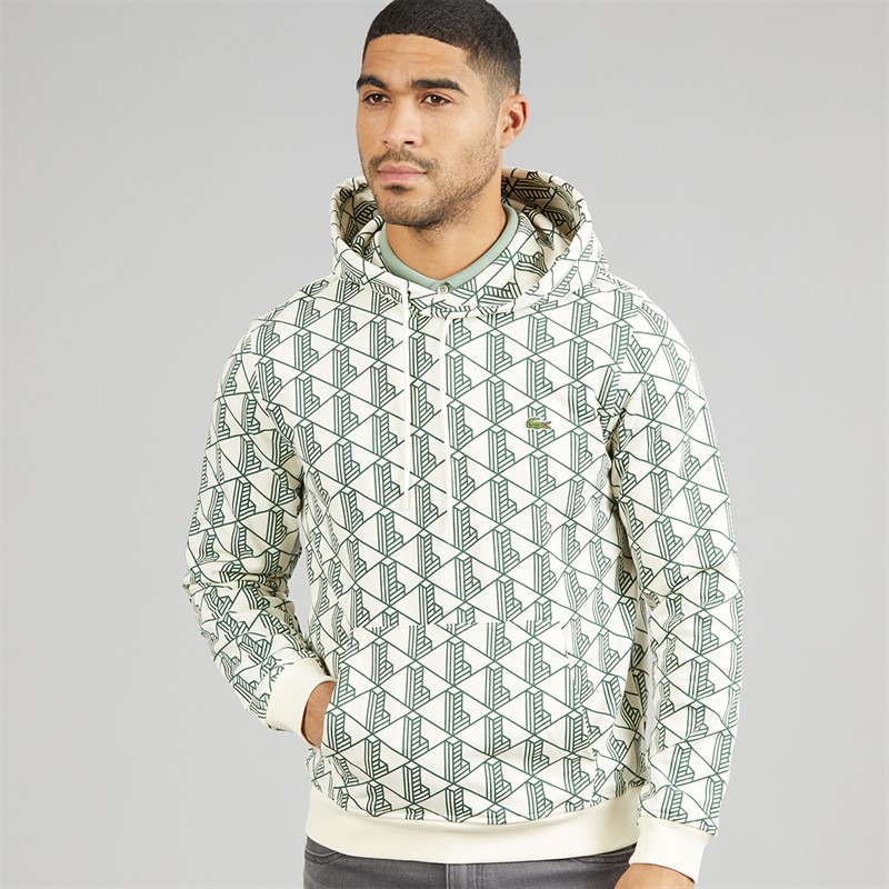 Lacoste Mens Monogram Fleece Hoodie White/Green