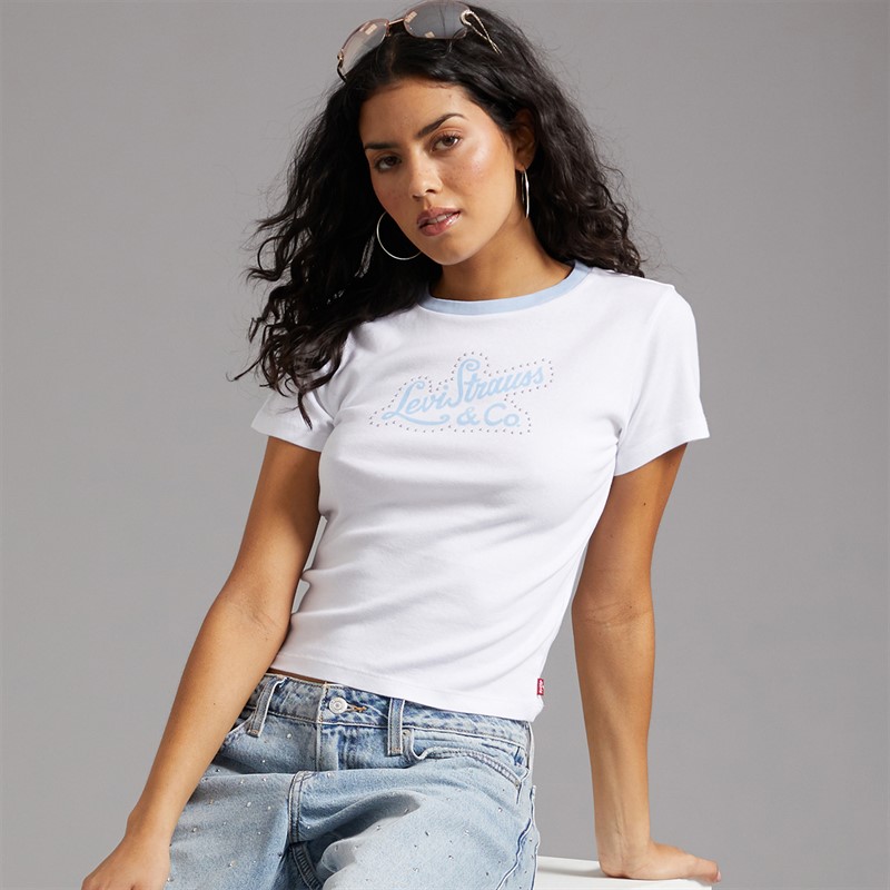 Levi's Womens Essential Sporty T-Shirt Script With Studs Bright White/Chambray B Levis Script With Studs Bright White/Chambray B